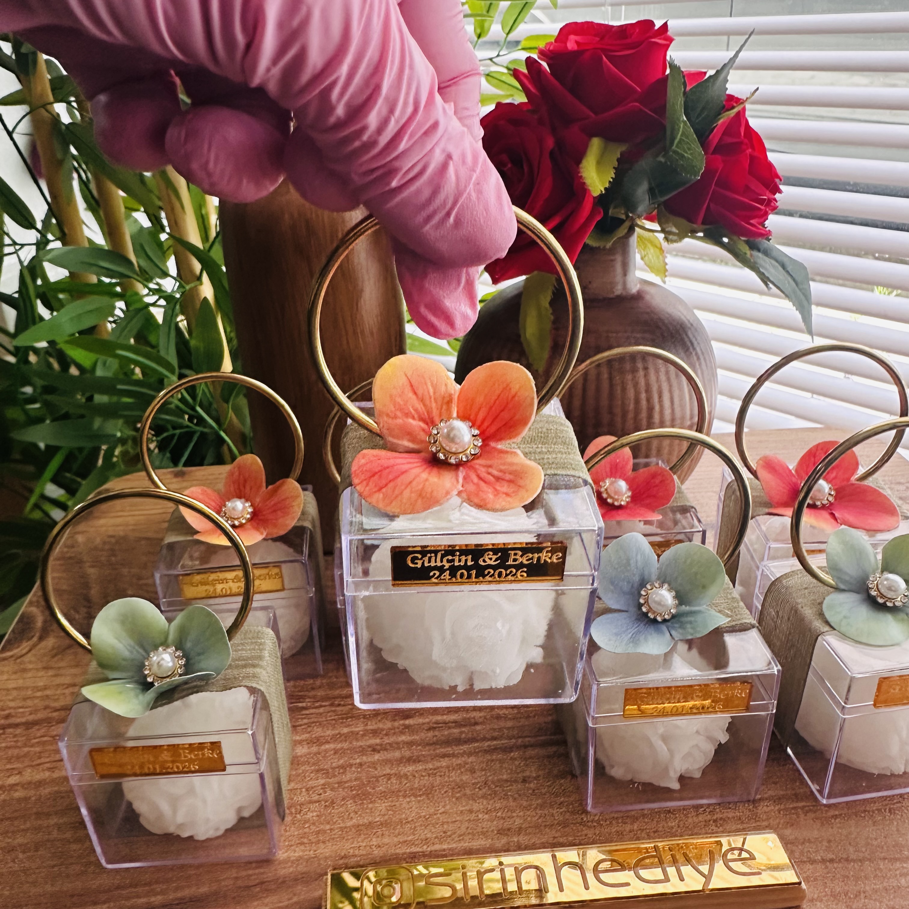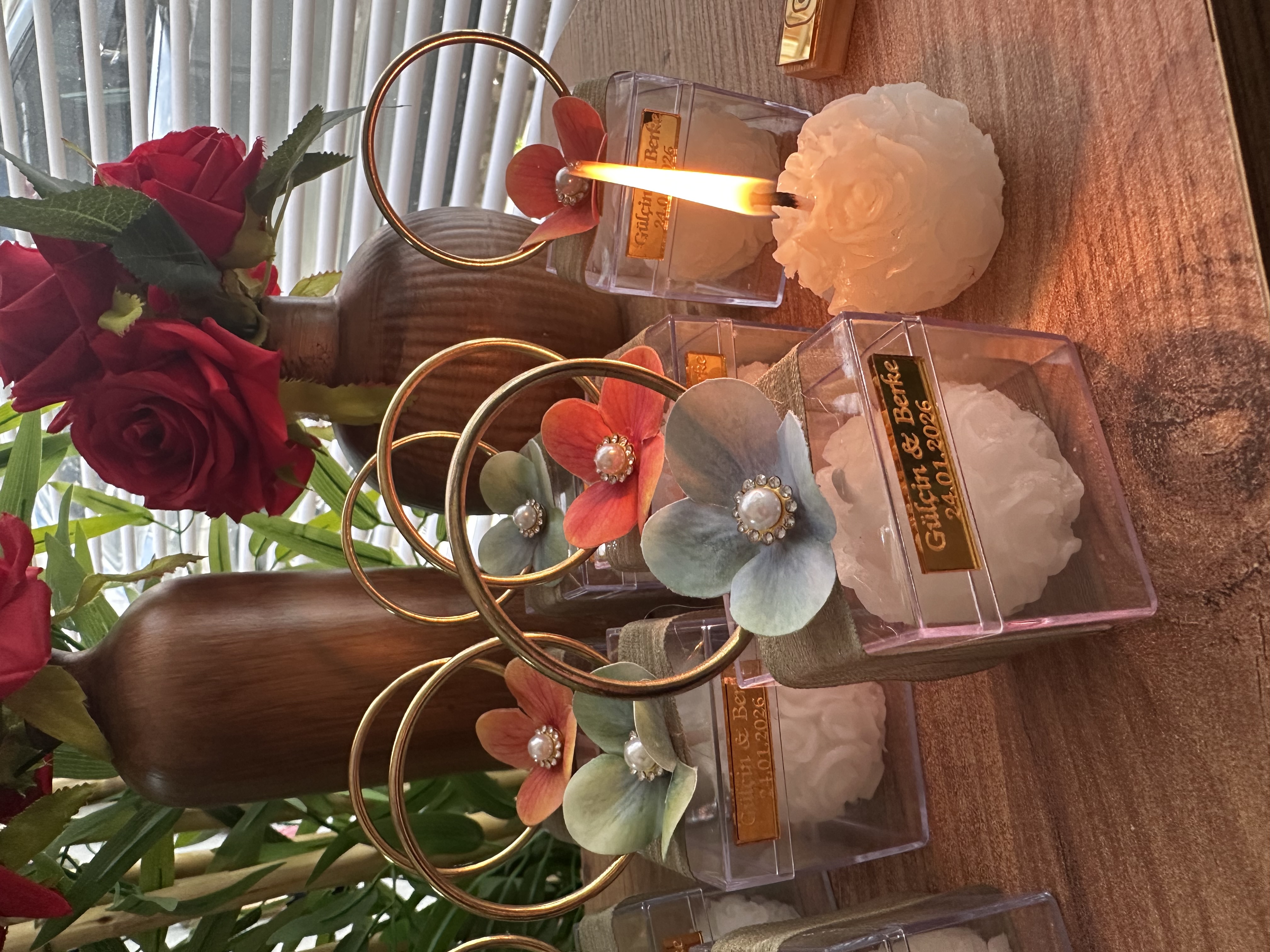 5x5 cm Mika kutu içinde gül mum hediyelikleri. Mika kutu üzerinde gold yuvarlak metal halka ile tutma yeri eklenmiştir.