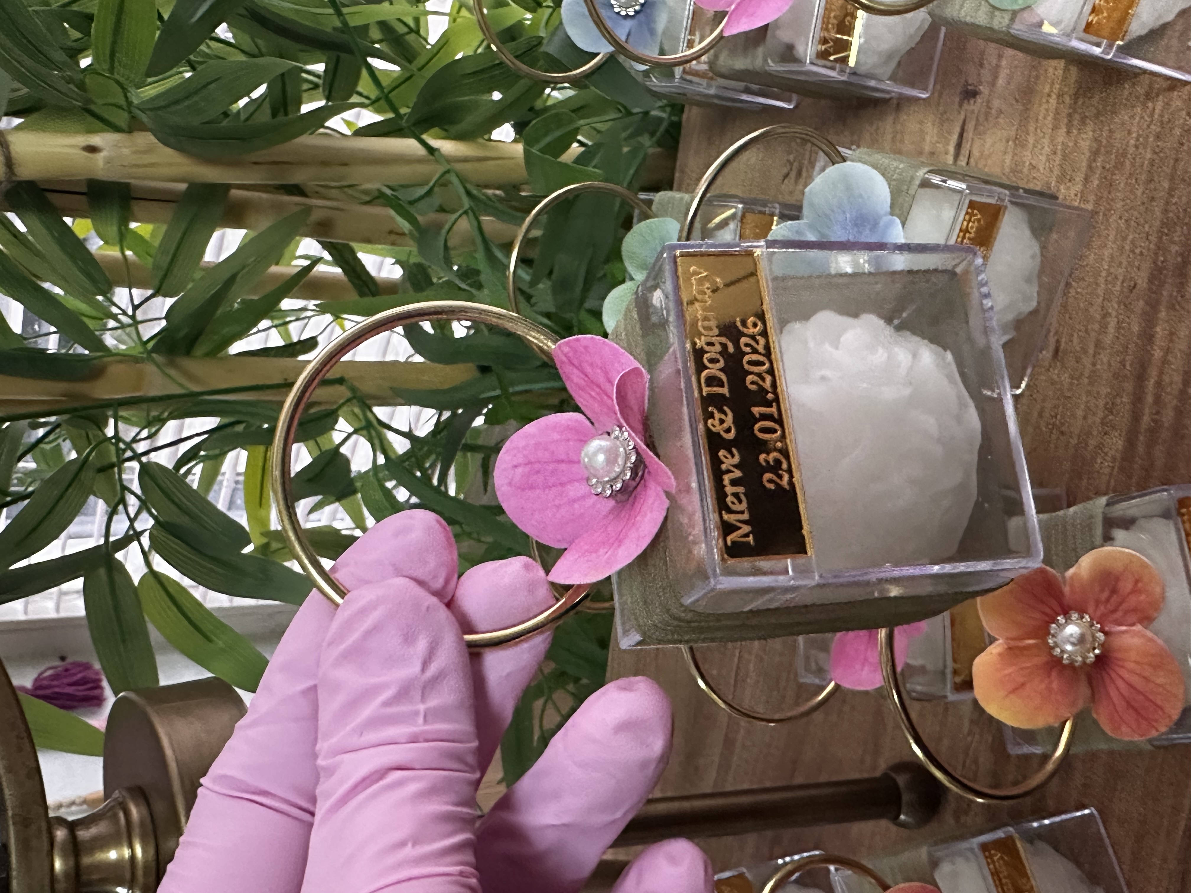 Renkli ortanca çiçekler ve taşlı inci süslenmiştir. Pleksi ayna üzerine istediğiniz yazıyazılabilir.