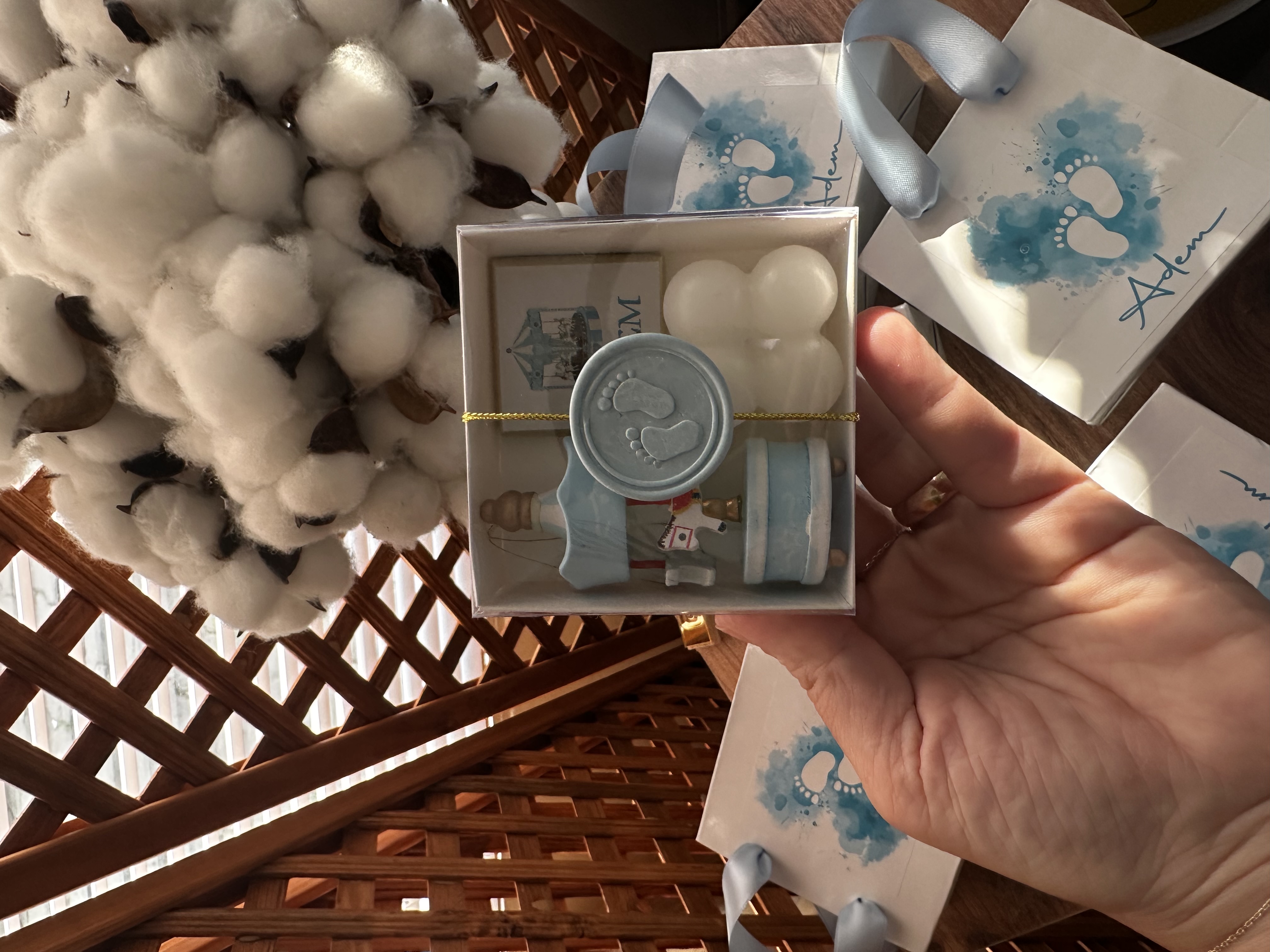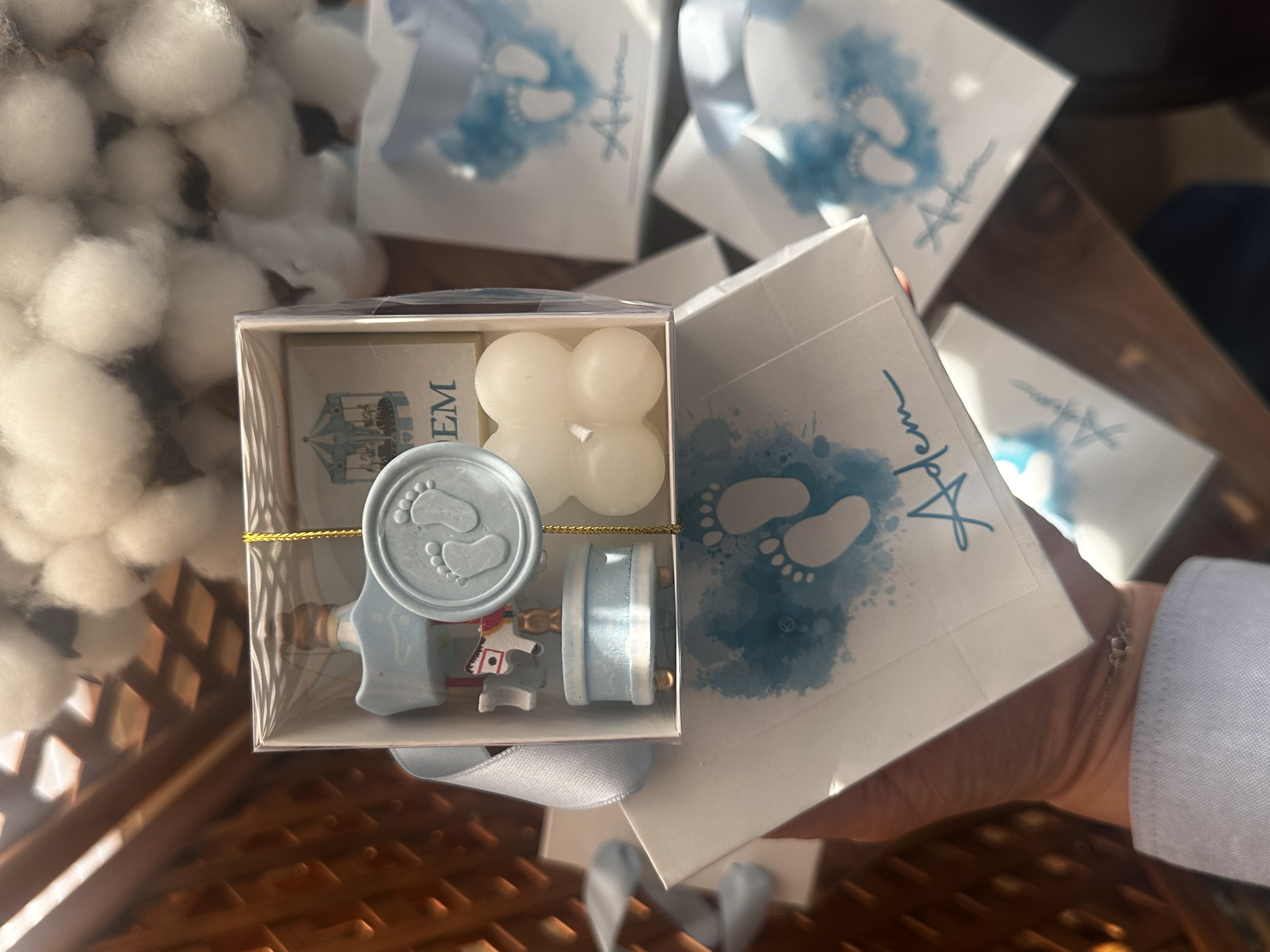 Ahşap atlı karınca, mum, isimli çikolata kutusu.