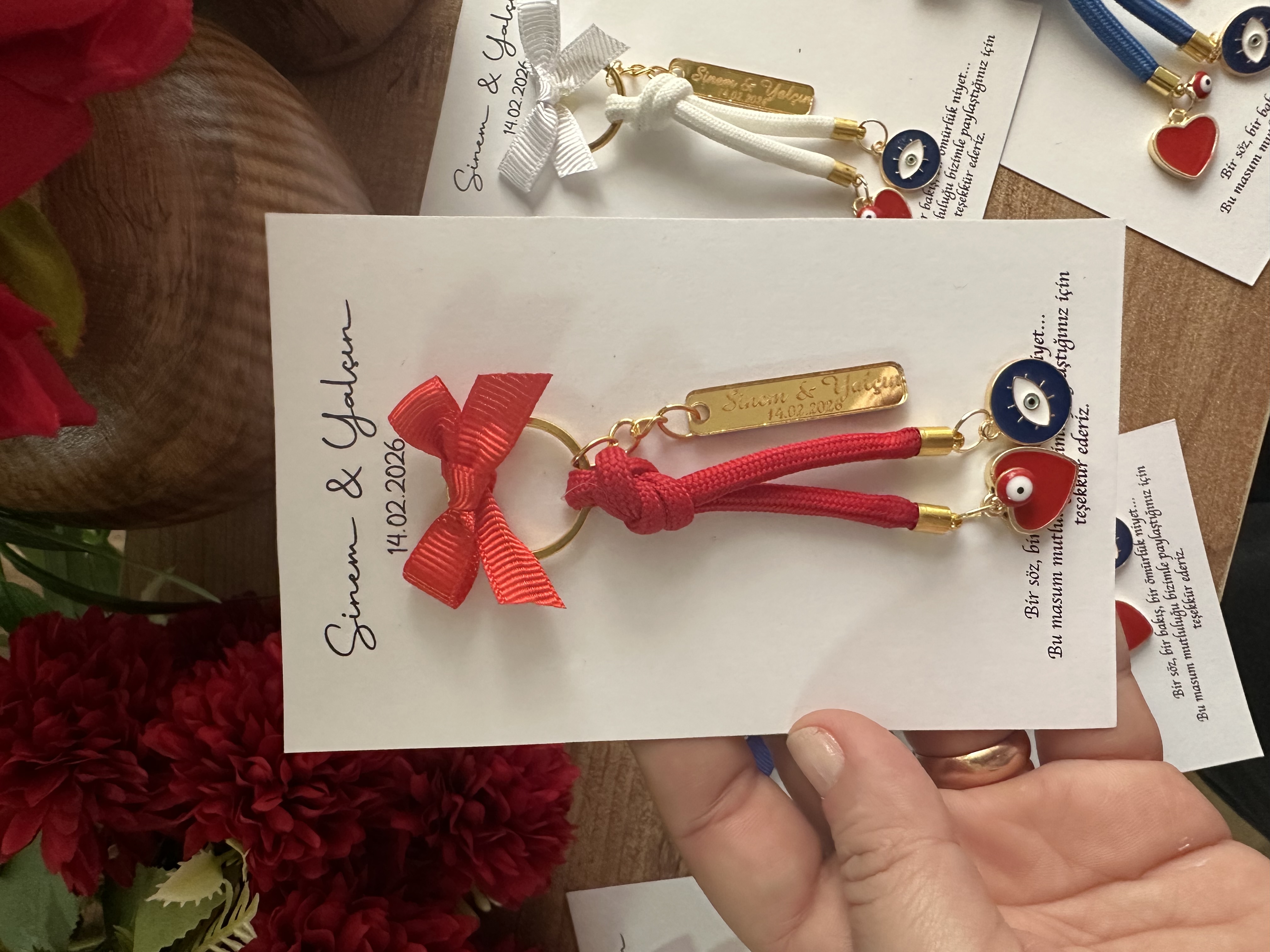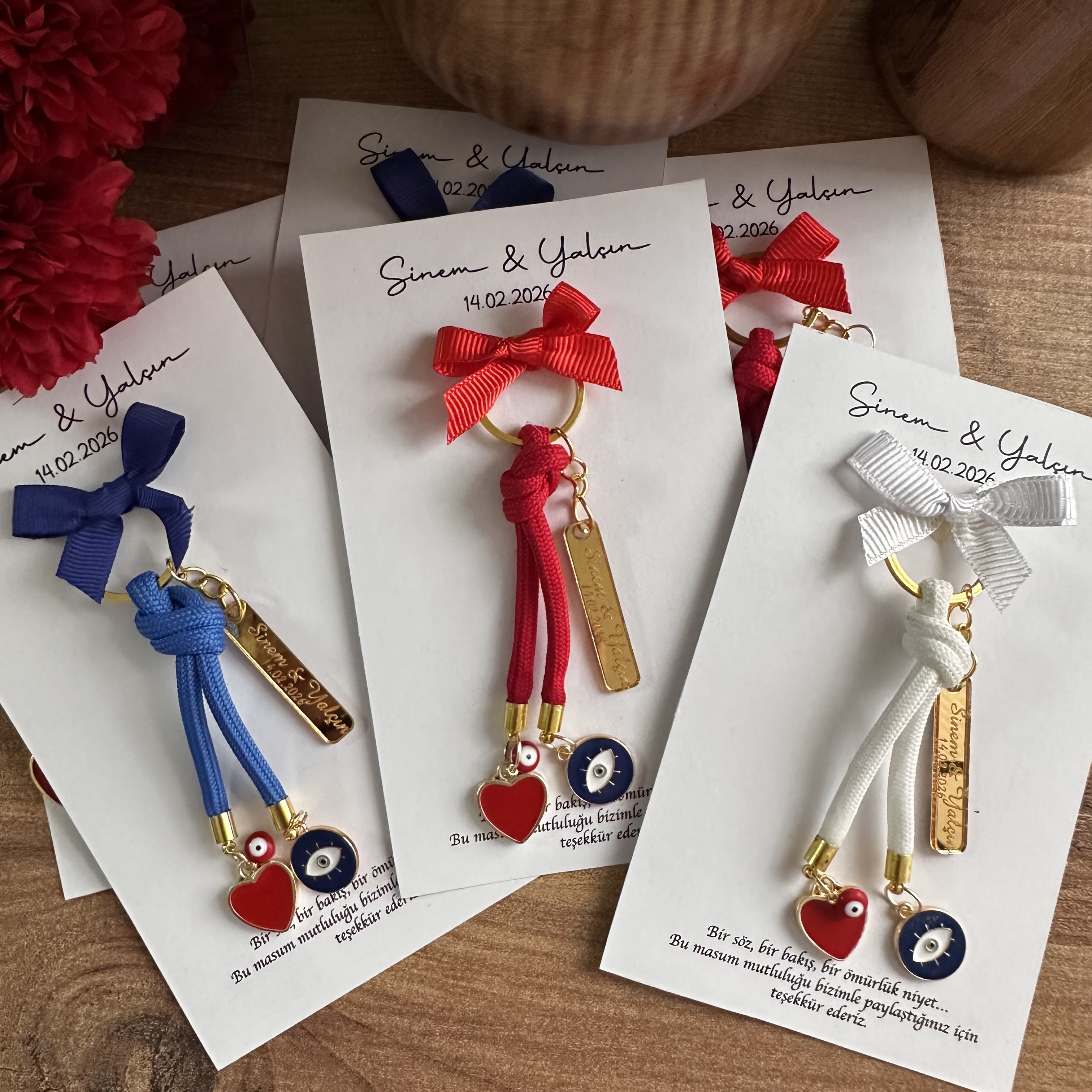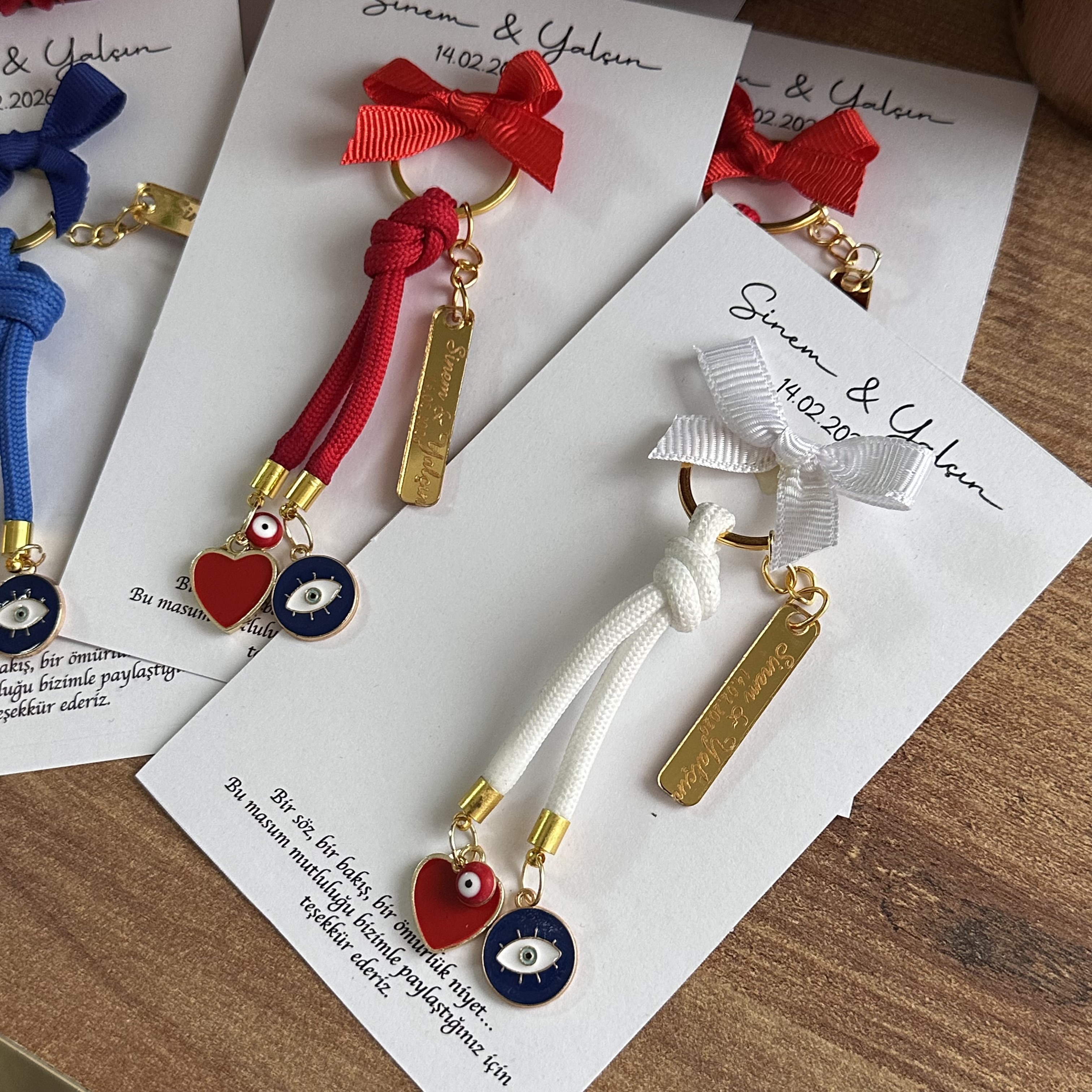 İsim & tarih baskılı kart, zarif kurdele ve nazar-kalp detaylarıyla göz dolduran tasarım charm anahtarlık.